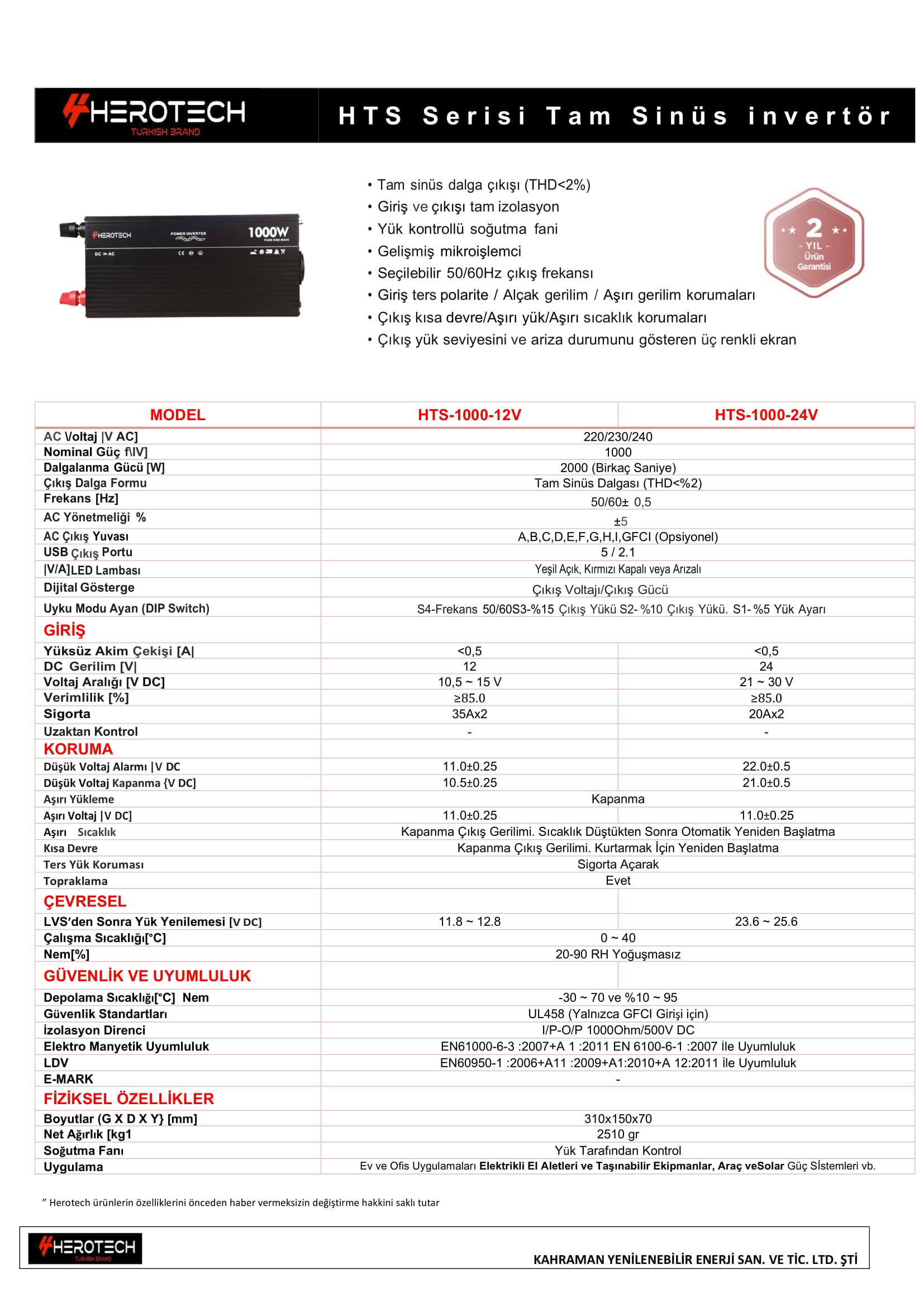 Herotech 1000 Watt 12 Volt Tam Sinüs İnverter Tam sinüs inverter sinüs dalgası üretir ve bu inverterler şebeke frekansına en yakın AC çıkışı verebilir. Modifiye sinüs inverterlerin yüksek güçlere dayanımı olmadığından buzdolabı, çamaşır makinesi, ütü, klima, tv gibi her türlü cihazı çalıştırabilmek için tam sinüs inverter tercih edilmelidir. Güneş enerjisinden yararlanarak elektrik elde edilmek istendiğinde en yaygın kullanılan inverter türü tam sinüs inverterler , doğru akımı alternatif akıma çevirerek elektriğin kullanılabilir hale gelmesini sağlar. Güneş panelleri sayesinde üretilen enerjiyi ev veya iş yerlerinde yada istediğiniz her yerde kullanılması tam sinüs inverter sayesinde gerçekleşir. Doğru akım ve alternatif akım arasında denge kurduğu için aşırı elektrik yüklemesi nedeniyle teknik ve donanımsal sorunların çıkması önlenmiş olur.