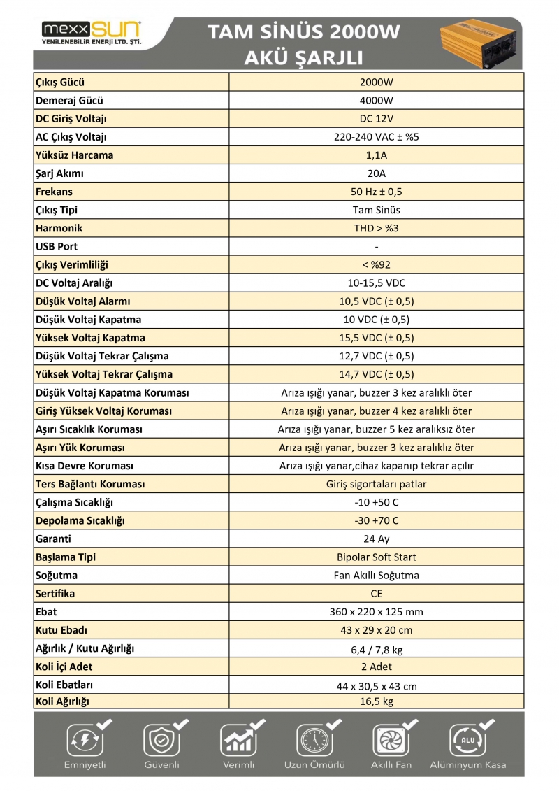 - Yüksek Güç Kapasitesi: 2000W çıkış gücü, çeşitli cihazları destekler.