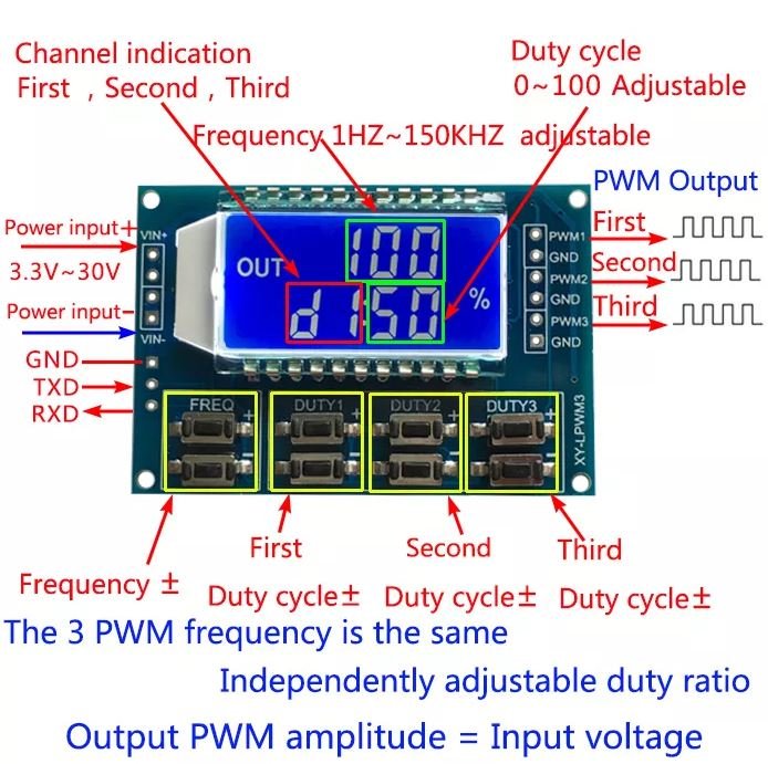 3-Kanal PWM Sinyal Jeneratörü Devresi XY-LPWM3.Aynı anda 3 kanal PWM çıkışına sahiptir.Geniş frekans aralığına ve yüksek hassasiyete sahiptir.DC 3.3 - 30V ile çalışır.Üzerinde bulunan lcd ekran ve kontrol butonlarıyla cihaz rahatlıkla kontrol edilebilir.