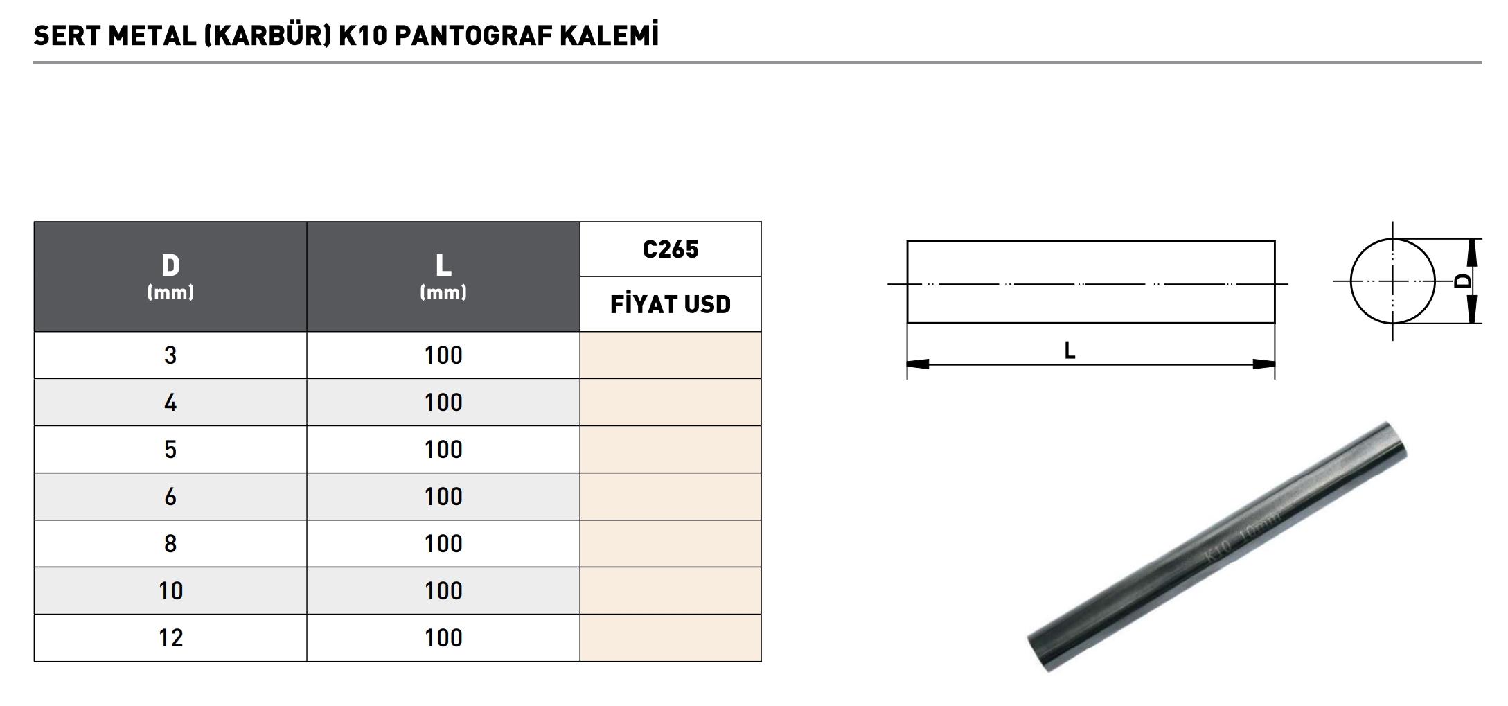 5X100MM Pld C265 Karbür Sert Metal K10 Pantograf Kalemi