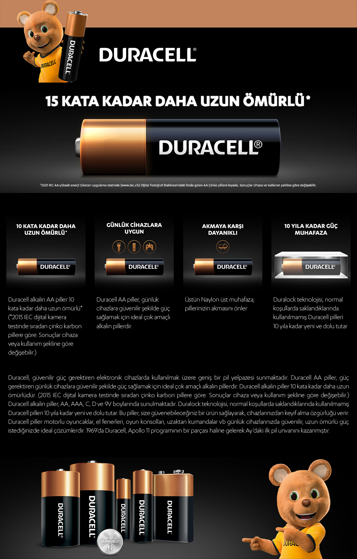 Duracell, güvenilir güç gerektiren elektronik cihazlarda kullanılmak üzere geniş bir pil yelpazesi sunmaktadır. Duracell alkalin piller, yüksek enerji tüketimi olan tüm cihazlarınıza ekstra performans adına güç sağlamak için ideal alkalin pillerdir. Duracell alkalin piller, daha uzun ömürlüdür* 2021 IEC AA yüksek enerji tüketen uygulama testinde ( ) Dijital Fotoğraf Makinesindeki önde gelen AA Çinko pillere kıyasla. Sonuçlar cihaza ve kullanım şekline göre değişebilir) AA ve AAA, C, D ve 9V boylarında sunulmaktadır. Duralock teknolojisi, normal koşullarda saklandıklarında kullanılmamış Duracell pilleri 10 yıla kadar yeni ve dolu tutar. Bu piller, Duracell’in dijital kamera, flaş, yüksek enerji tüketimli oyuncaklar veya müzik setleri gibi yüksek enerji ihtiyacı olan cihazlar için en iyi alkalin pilleridir ve elbette motorlu oyuncaklar, fenerler, taşınabilir oyun kontrol cihazları, tıraş makineleri, elektrikli diş fırçaları ve sürekli kullanılan diğer tüm cihazlar için de harika birer seçenektir. 1969’da Duracell, Apollo 11 programının bir parçası haline gelerek Ay’daki ilk pil unvanını kazanmıştır.