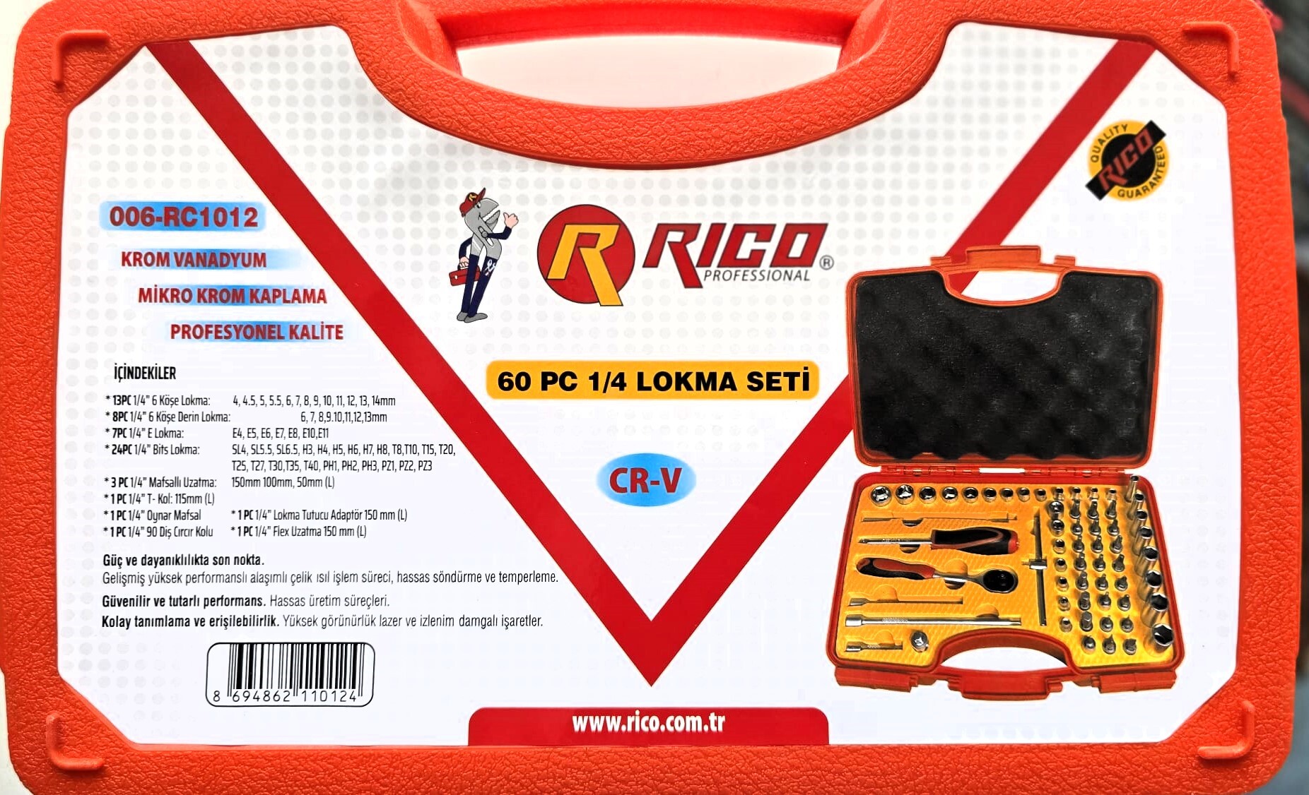 Rico 1/4 Lokma Takımı Seti 6 Köşe 60 Parça Set İçeriği; 1/4 6 Köşe Lokmalar ; 4mm - 4,5mm - 5mm - 5,5mm - 6mm - 7mm - 8mm - 9mm - 10mm - 11mm - 12mm - 13mm - 14mm 1/4 6 Köşe Derin Lokmalar ; 6mm - 7mm - 8mm - 9mm - 10mm - 11mm - 12mm - 13mm 1/4 E Lokmalar ; E4 - E5 - E6 - E7 - E8 - E10 - E11 1/4 Bits Lokmalar ; SL4 - SL5,5 - SL6,5 - H3 - H4 - H5 - H6 - H7 - H8 - T8 - T10 - T15 - T20 - T25 - T27 - T30 - T35 - T40 - PH1 - PH2 - PH3 - PZ1 - PZ2 - PZ3 1/4 Mafsallı Uzatmalar ; 150mm - 100mm - 50mm (L) 1/4 T-KOL: 115mm (L) 1/4 Oynar Mafsal 1/4 Cırcır Kolu 90 Diş 1/4 Lokma Tutucu Adaptör 150MM (L) 1/4 Flex uzatma 150mm (L)