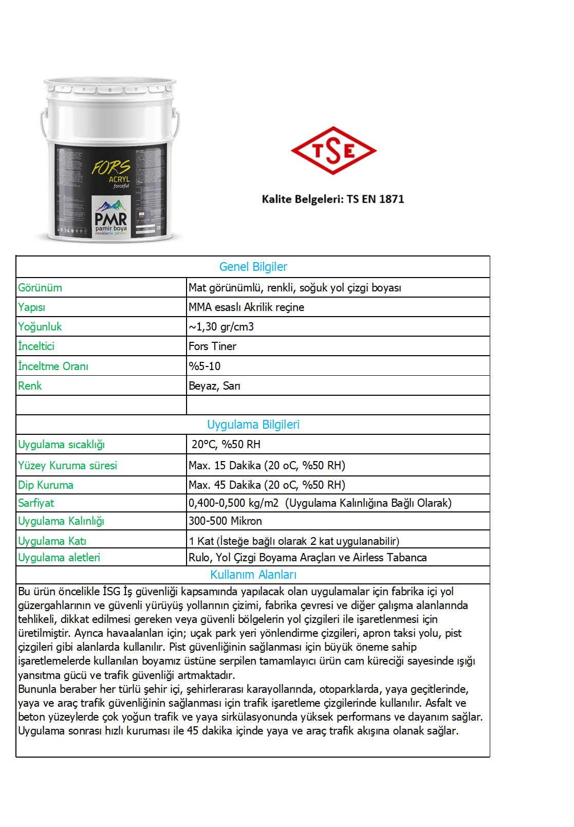 MMA esaslı akrilik solventbazlı, tek bileşenli, yansıtma gücü mükemmel, yüksek örtücülük ve parlaklık özelliğine sahip,