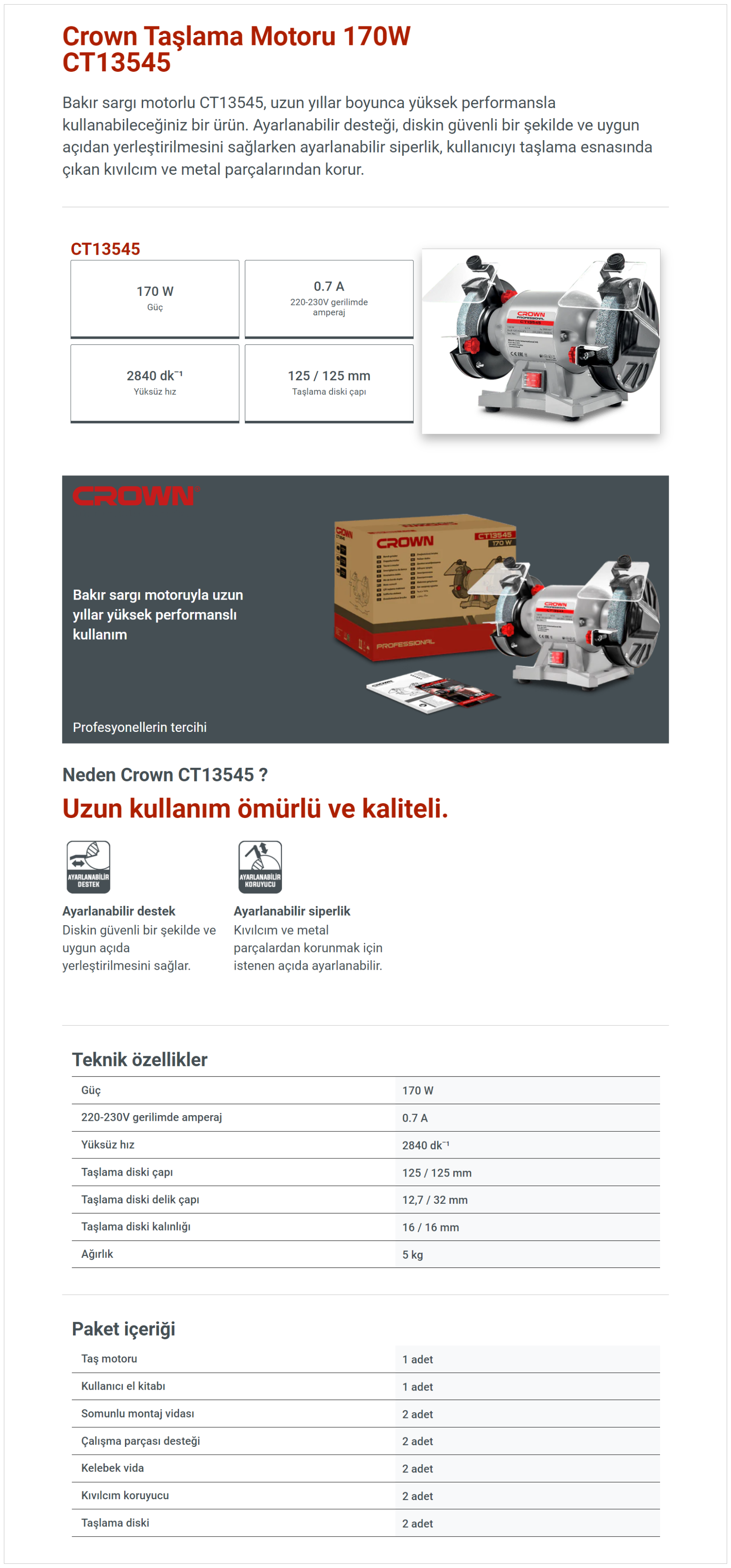 Bakır sargı motorlu CT13545, uzun yıllar boyunca yüksek performansla kullanabileceğiniz bir ürün. Ayarlanabilir desteği, diskin güvenli bir şekilde ve uygun açıdan yerleştirilmesini sağlarken ayarlanabilir siperlik, kullanıcıyı taşlama esnasında çıkan kıvılcım ve metal parçalarından korur.
