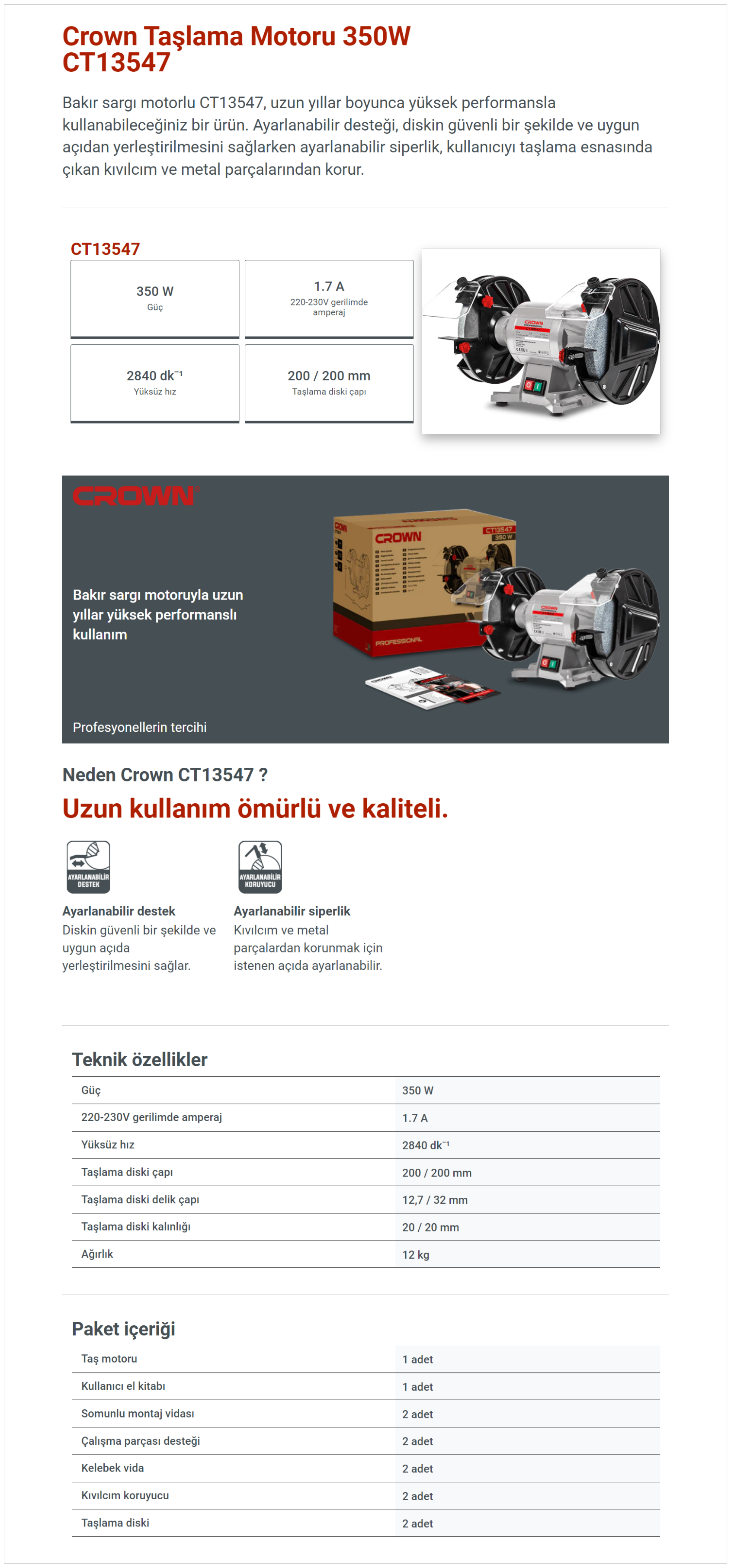 Bakır sargı motorlu CT13547, uzun yıllar boyunca yüksek performansla kullanabileceğiniz bir ürün. Ayarlanabilir desteği, diskin güvenli bir şekilde ve uygun açıdan yerleştirilmesini sağlarken ayarlanabilir siperlik, kullanıcıyı taşlama esnasında çıkan kıvılcım ve metal parçalarından korur.
