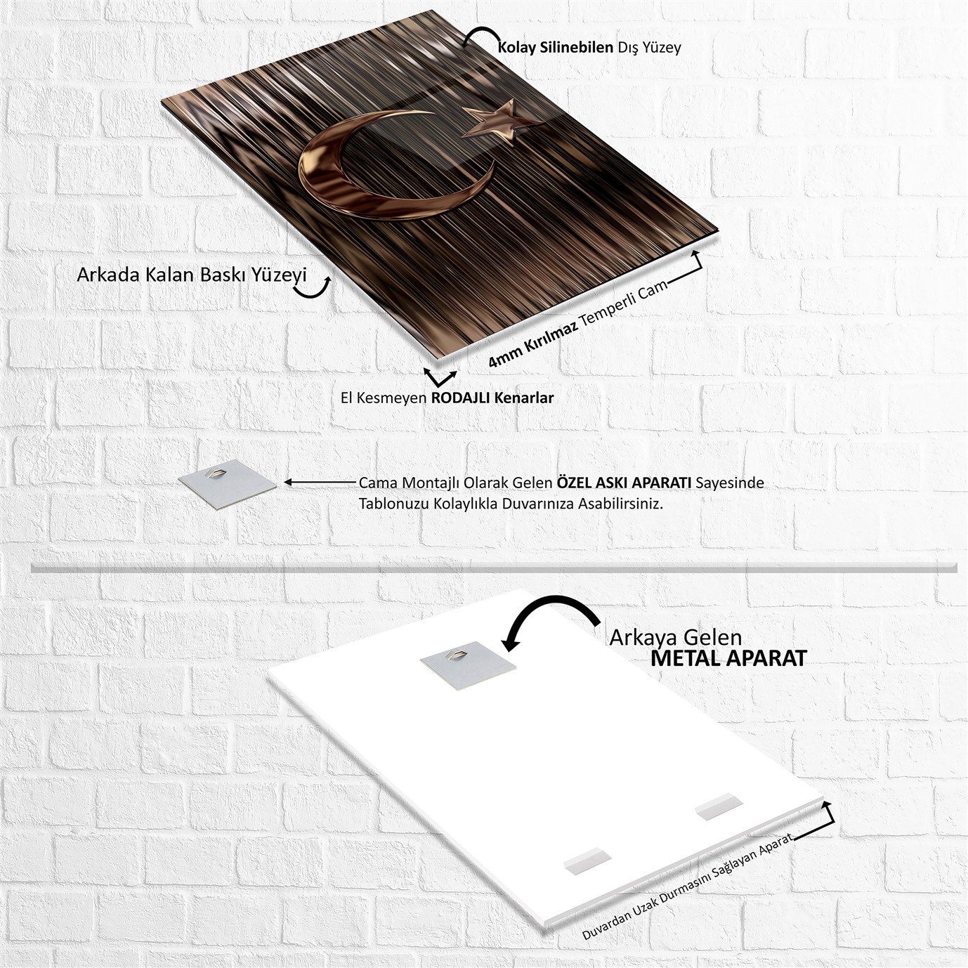 Doğrudan camın arka yüzenine uv baskı tekniğiyle yüksek çözünürlüklü makinelerle üretilmektedir.