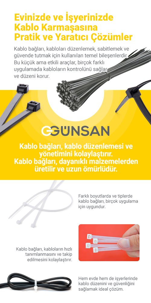 - Pratik Kullanım: Bağı kullanmak için kabloların bir araya getirilmesi ve ardından kilidin kapatılması gerekir. Kilit kablonun genişliğine uygun biçimde ayarlanabilir.