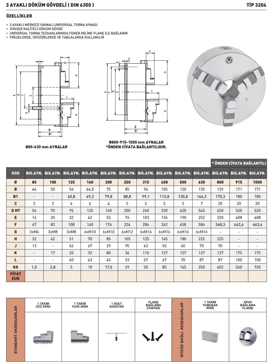 BIS.AYN.250 Bison DIN6350 4 Ayaklı Döküm Gövdeli Torna Aynası