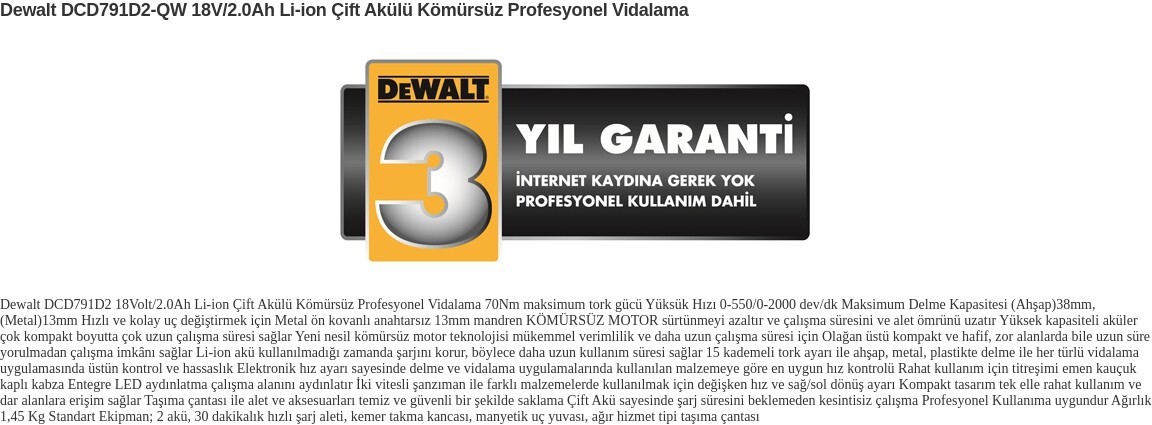 DEWALT Dcd791d2 18volt/2.0ah Li-ion Çift Akülü Kömürsüz Vidalama