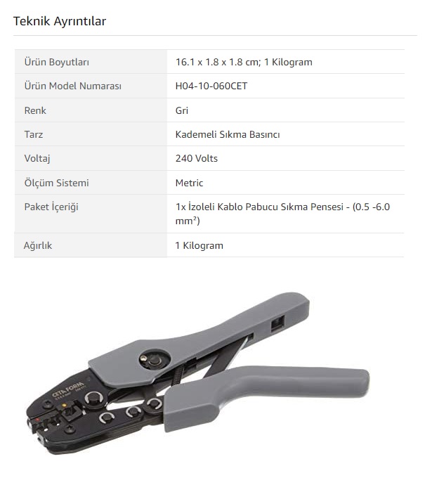 Ceta Form E69-YT1 İzoleli Kablo Pabucu Sıkma Pensesi 0.5-6.0 220
