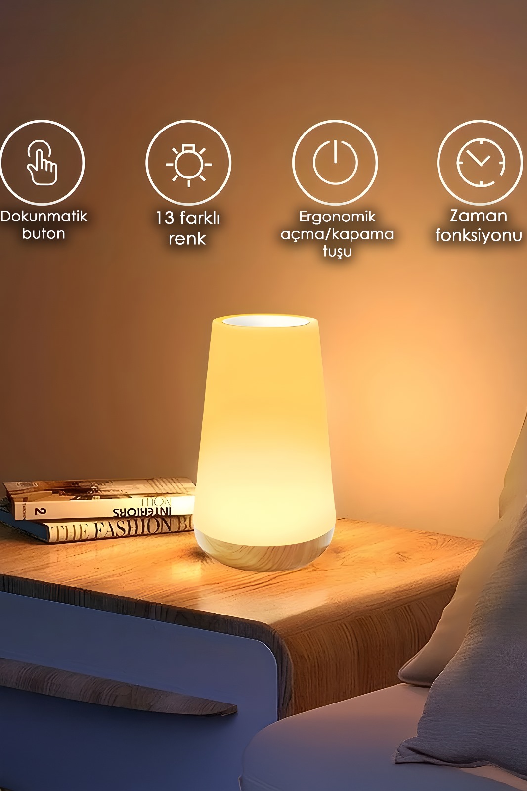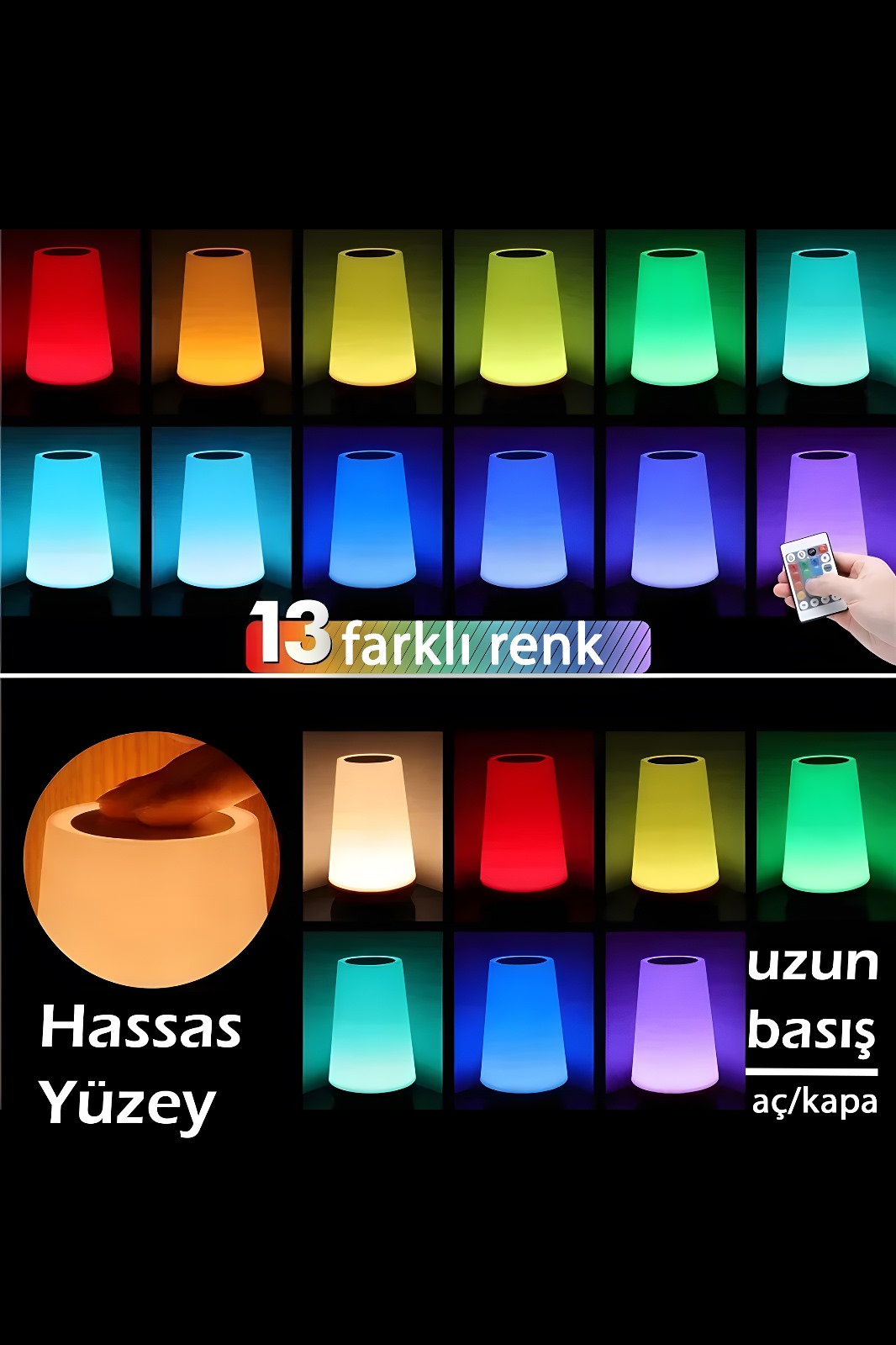Uzaktan Kumanda 13 Renkli EkranKırmızı-yeşil-mavi renk spektrumundan geniş bir renk yelpazesini otomatik olarak değiştirin veya en sevdiğinizi seçip duraklatın, sadece dokunmatik lambanın üst kısmındaki kontrol paneline dokunun ve istediğiniz renkleri değiştirin, bu rahatlatıcı arka plan aydınlatması ve okuma için harika.