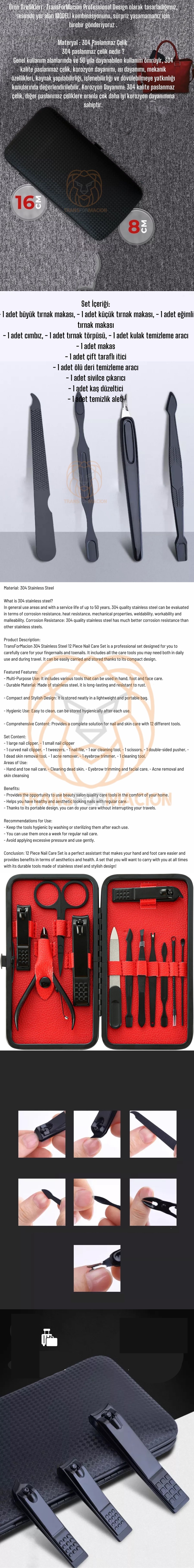 12 Parça Tırnak Bakım Seti, el ve ayak bakımınızı kolaylaştıran, estetik ve sağlık açısından fayda sağlayan mükemmel bir yardımcıdır. Paslanmaz çelikten üretilmiş dayanıklı araçları ve şık tasarımıyla her an yanınızda taşımak isteyeceğiniz bir set!