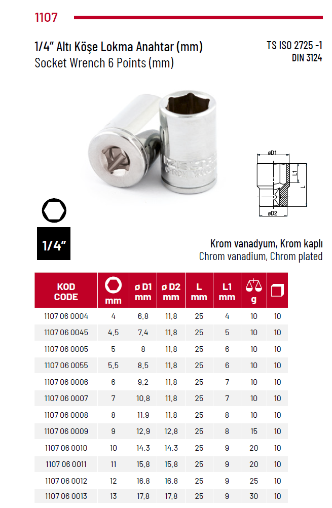 Izeltaş 1107 06 0009 9mm 1/4’’ Altı Köşe Lokma Anahtar