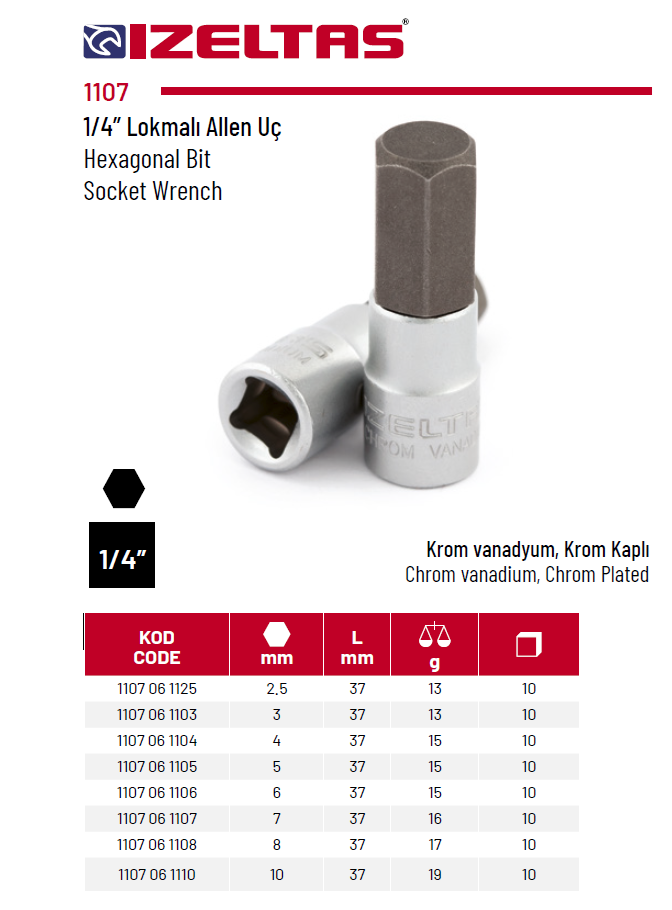 Izeltaş 1107 06 1110 10MM 1/4’’ Lokmalı Allen Uç