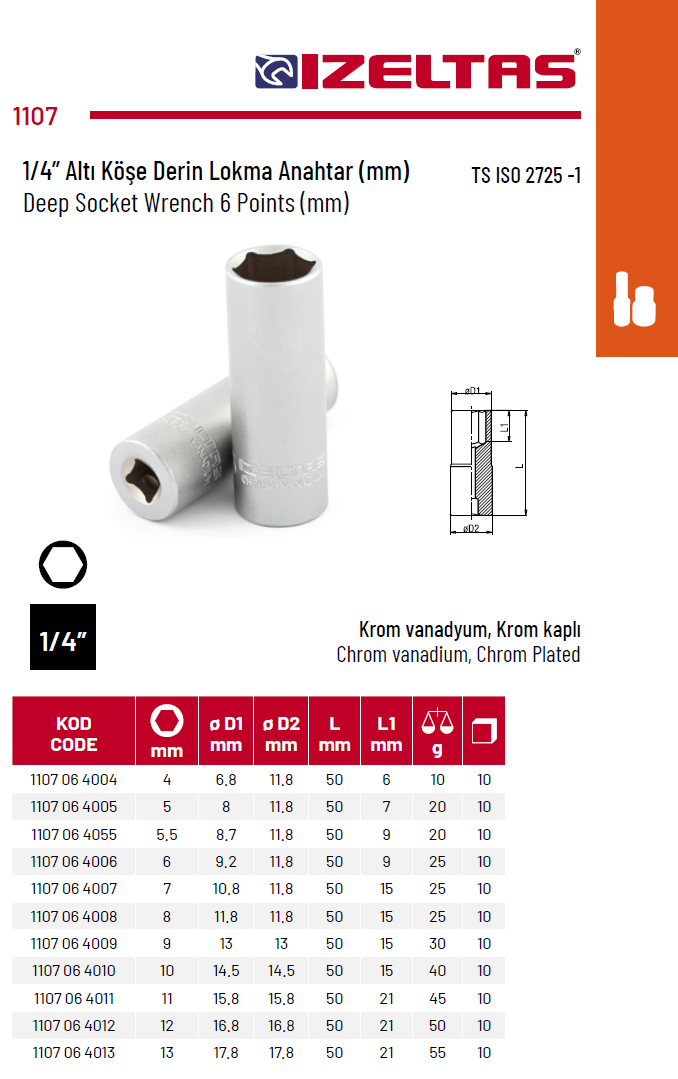Izeltaş 1107 06 4010 10MM 1/4’’ Altı Köşe Derin Lokma Anahtar