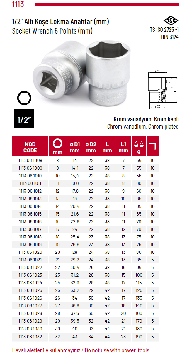 Izeltaş 1113 06 1020 20MM 1/2’’ Altı Köşe Lokma Anahtar (Mm)
