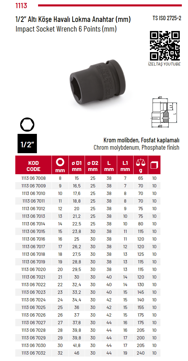 Izeltaş 1113 06 7016 16MM 1/2’’ Altı Köşe Havalı Lokma Anahtar (Mm)