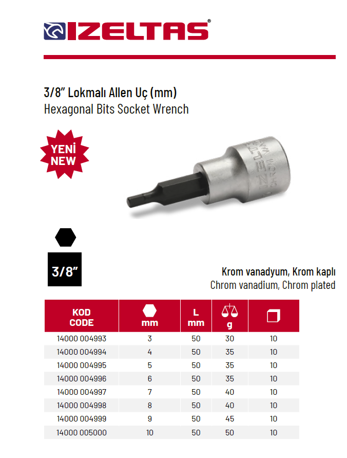 Izeltaş 14000 004998 8mm 3/8’’ Lokma Allen Anahtar