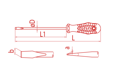 Krom vanadyum, Krom kaplı, Ucu siyah oksit, Selüloz asetat saplı D Uç Kalınlığı : 5.5 mm L Tornavida Boyu : 70 mm L1 Sungü Boyu : 25 mm Uç: a: 1mm b: 5.5 Ağırlık: 30 gr TSE, TS59