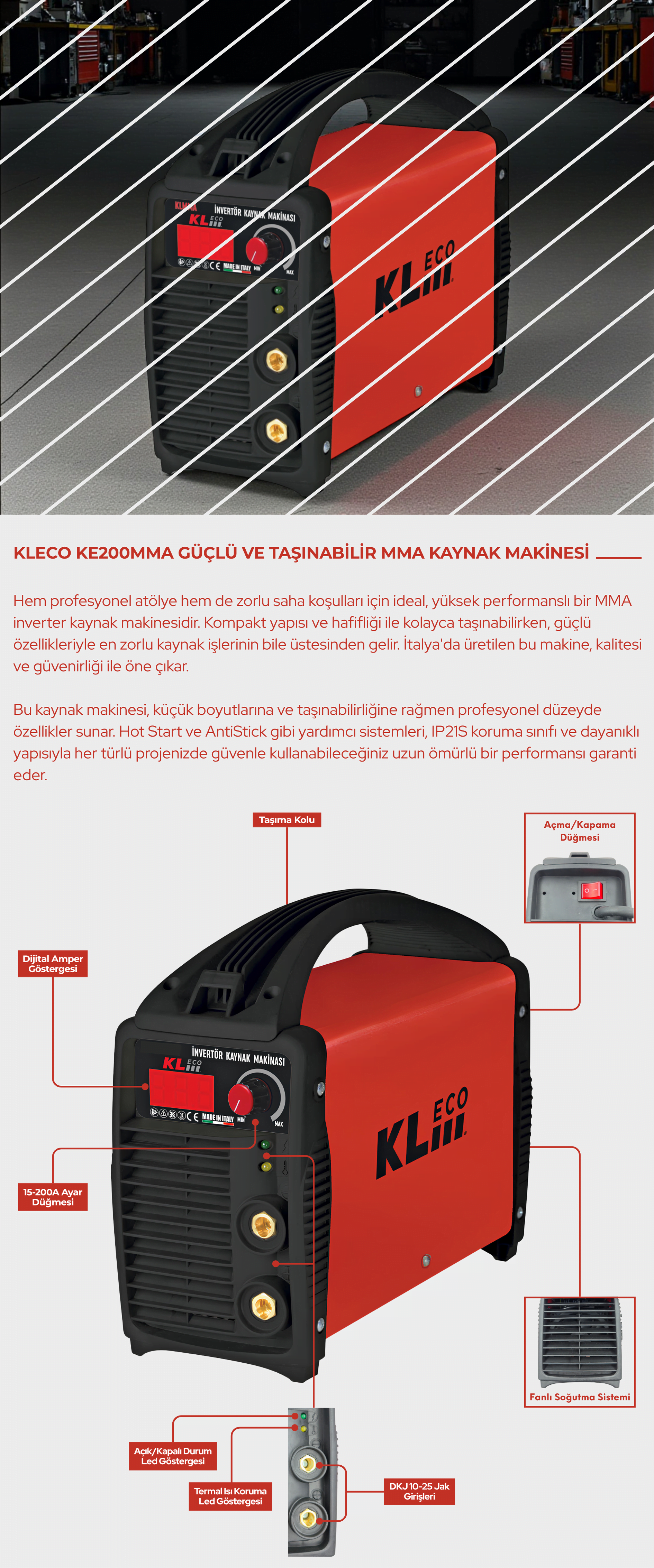 Küçük boyutuna rağmen sağlam dayanıklılık, dijital hassasiyet ve yüksek performansı bir arada sunan Kleco KE200MMA, profesyonel kalitede sonuçlar arayan herkes için doğru seçimdir. Hot Start ve AntiStick gibi özellikleri sayesinde hızlı ve kesintisiz kaynak yaparken, termostatik koruma ve IP21S sınıfı ile de uzun ömürlü bir performansı garanti eder.