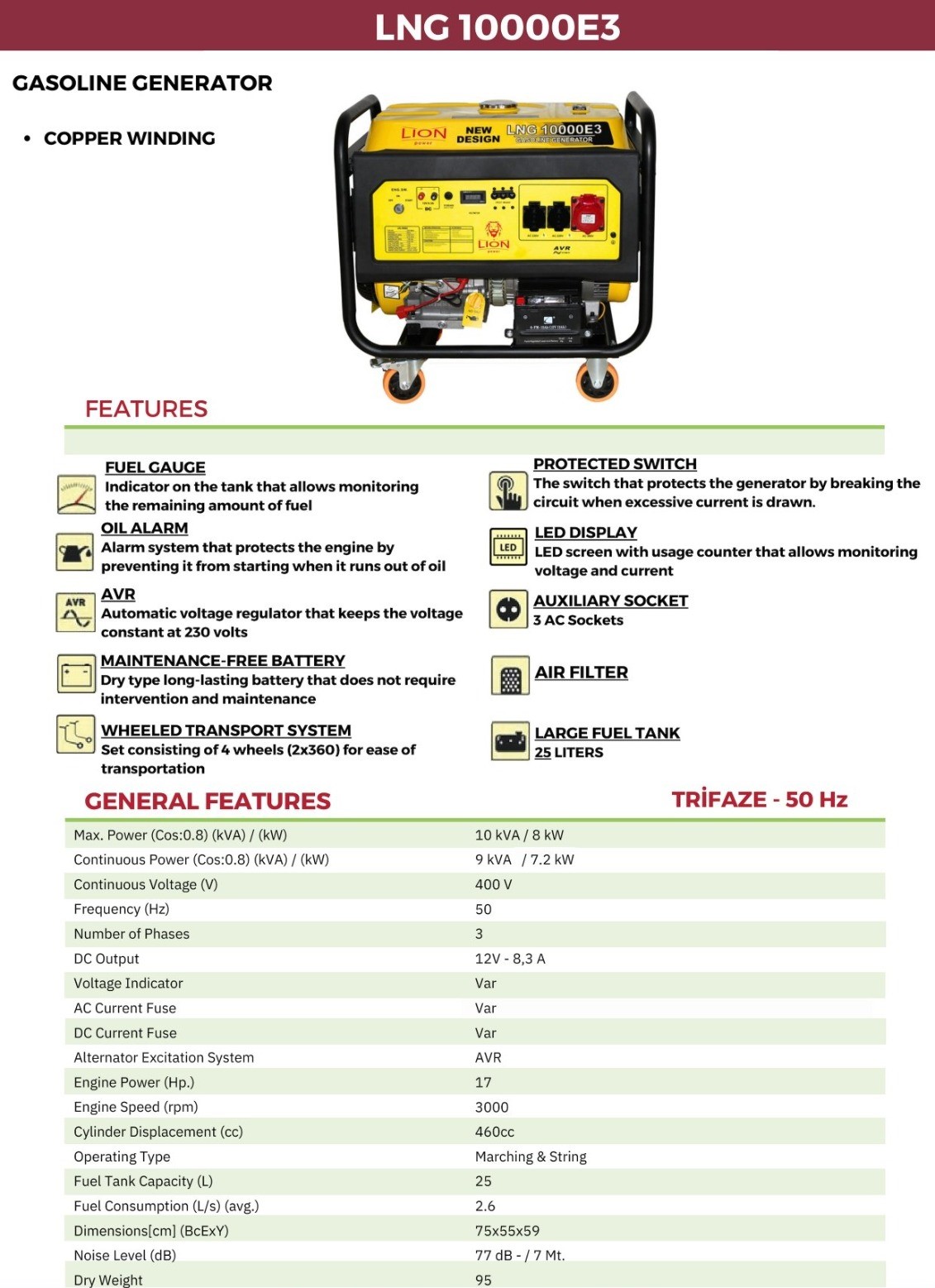 Lion power LNG10000e3 benzinli jeneratör her türlü elektrik ihtiyacınız için ideal bir çözüm sunar.; Hem evde hem de is yerlerinde, kesintisiz enerjiye ulaşmanızı sağlar.; Hem pratik hem de güçlü çözüm arayan kullanıcılar için iyi bir tercihtir.; Kompakt tasarımı ve dayanıklı tekerlekleri ile kolayca taşınabilir.; Hem ipli hem de marşlı başlatma özelliği, her koşulda kolayca çalıştırılabilir.