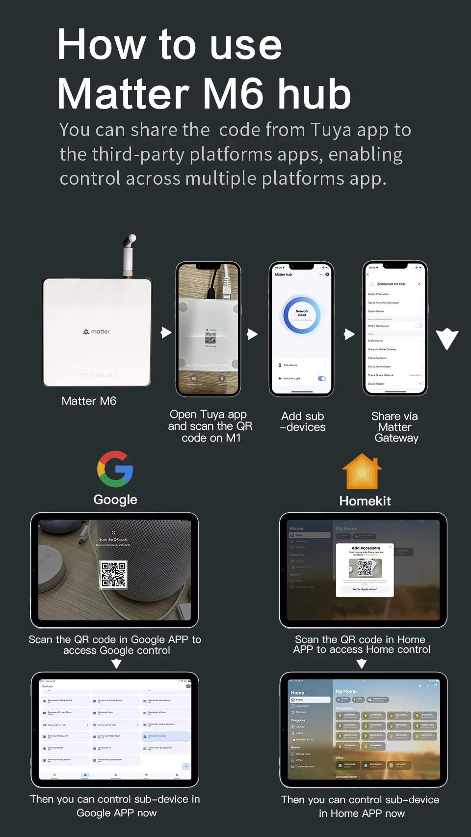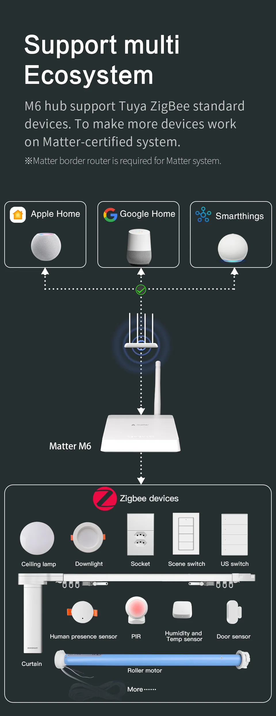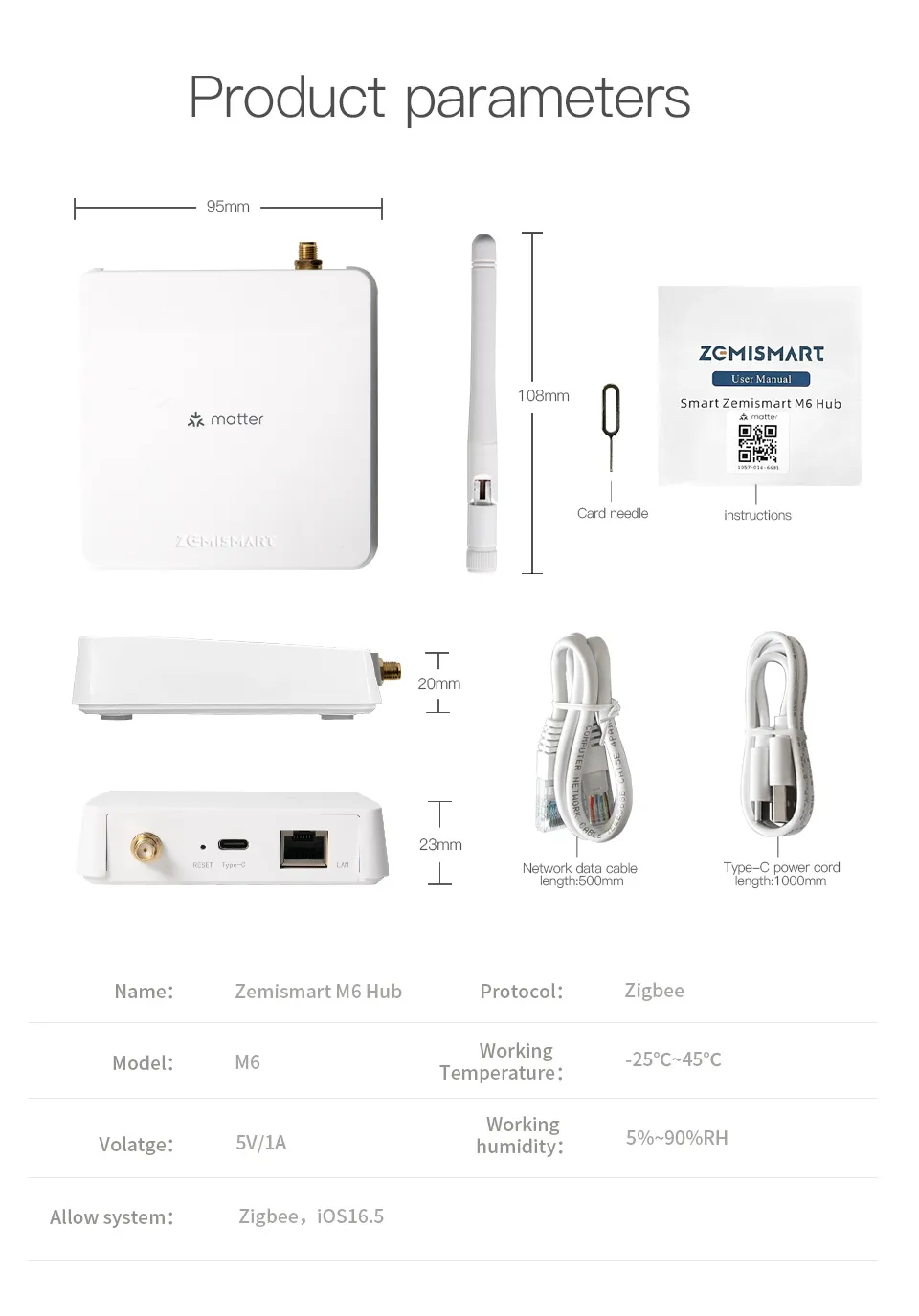 Zemismart M6 HUB, Tuya uyumlu Zigbee cihazlarınızı Matter Standartı üzerinden Homekit'e aktarmanızı sağlar. Tuya uyumlu cihazları Homekit'e aktarması için homepod ya da Apple TV zorunludur.