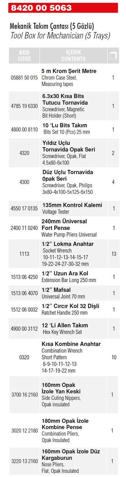 Mekanik Takım Çantası 5 Gözlü 62 Parça