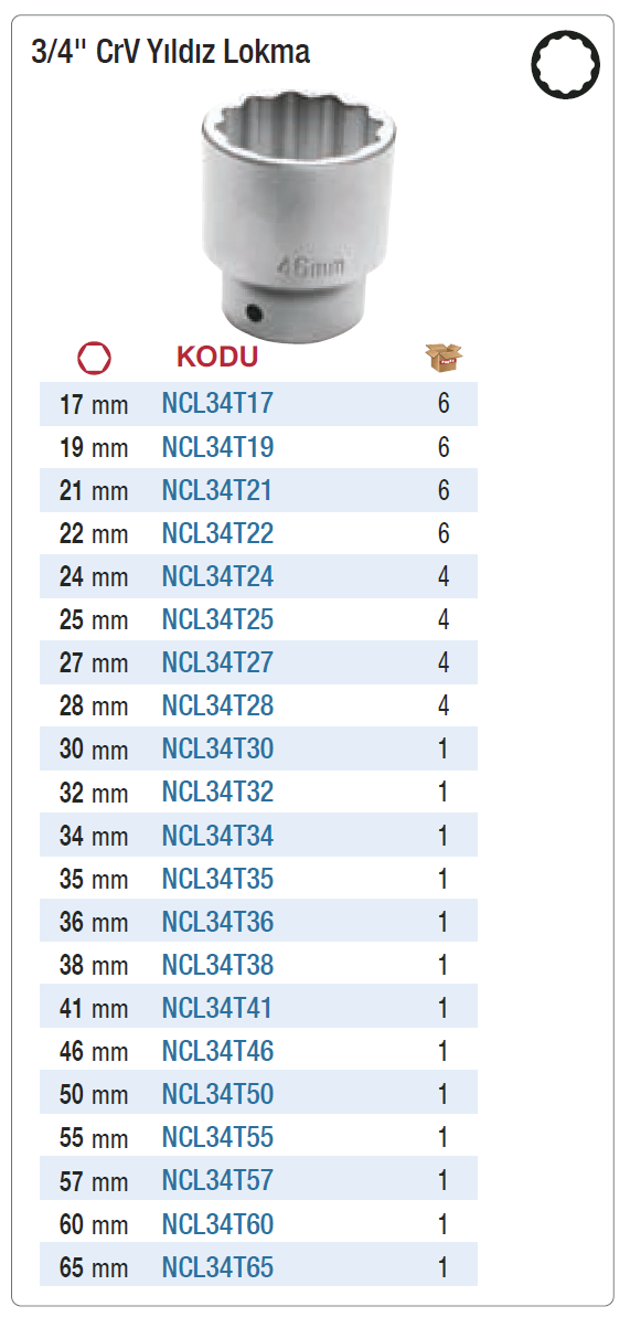 NCL34T65 65 mm 3/4’’ Crv Yıldız Lokma