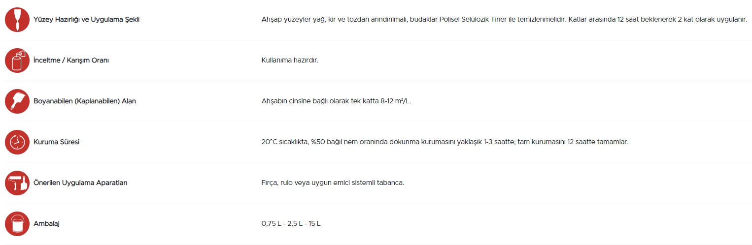 Alkid bağlayıcı esaslı, yarı şeffaf, mat görünümlü ahşap verniğidir. İç ve dış tüm ahşap yüzeylerde dekoratif amaçla kullanılan, kolay emilen yapısı ve formülündeki özel katkı maddeleri sayesinde ahşaba derinlemesine işleyen mat verniktir. Üzerine her türlü mobilya verniği uygulanabilir.