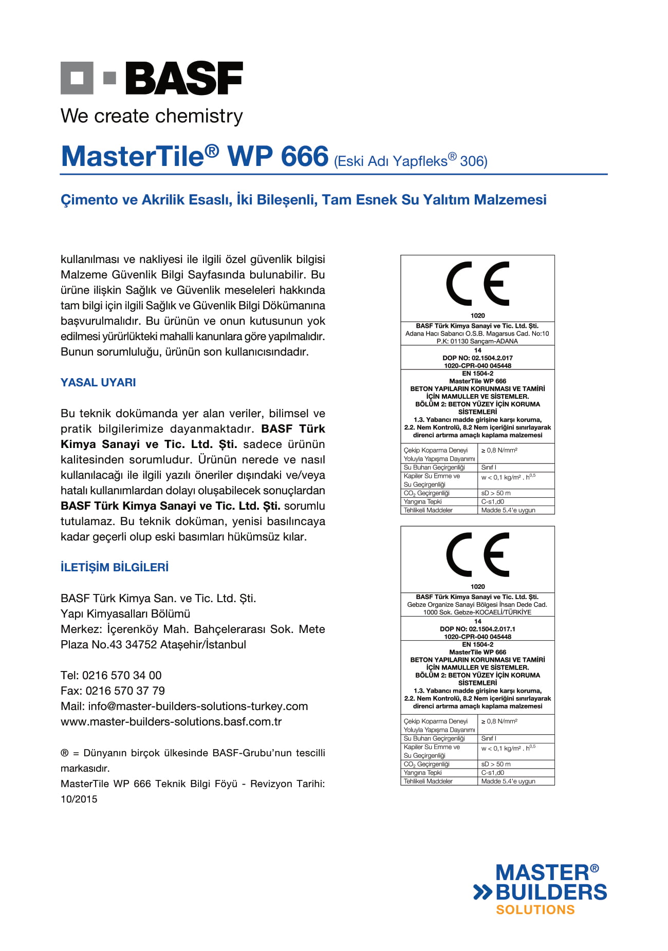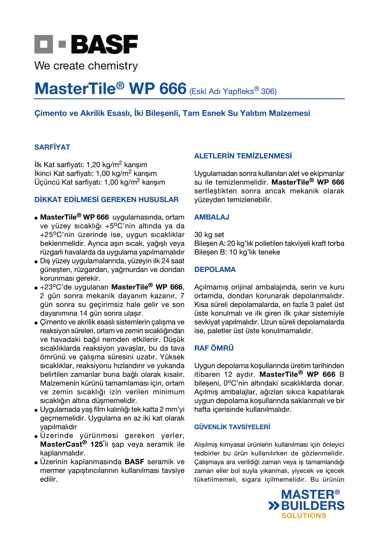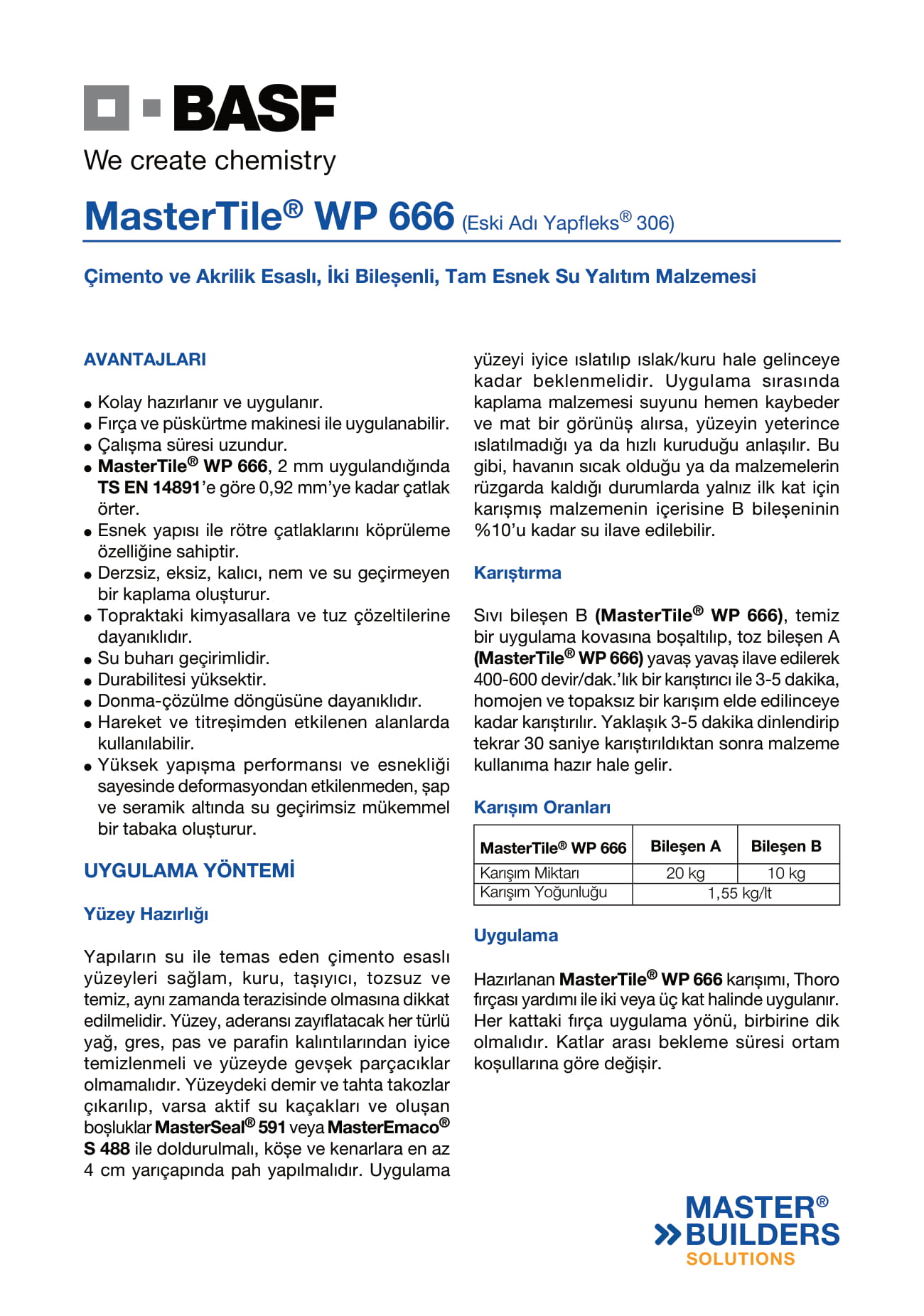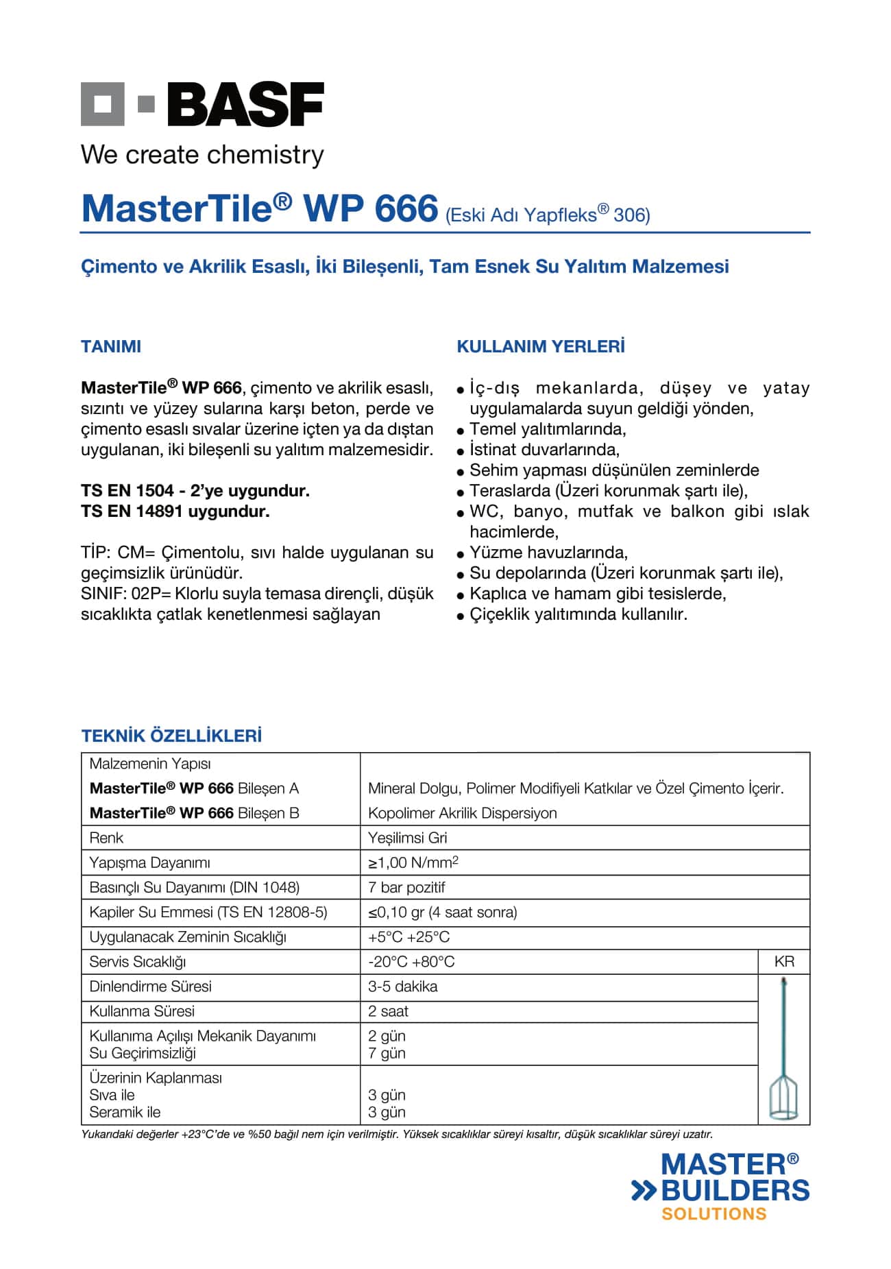 MasterTile WP 666, çimento ve akrilik esaslı, sızıntı ve yüzey sularına karşı beton, perde ve çimento esaslı sıvalar üzerine içten ya da dıştan uygulanan, iki bileşenli seramik altısu yalıtım malzemesi.
