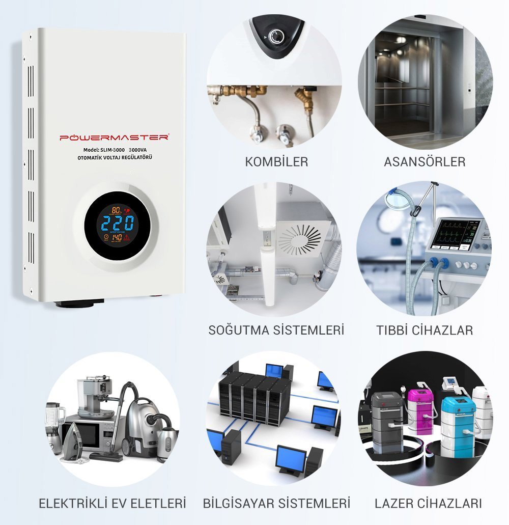 - Powermaster Slim-3000 Otomatik 3000 Watt Voltaj Regülatörü, evinizde veya iş yerinizde güvenli ve sorunsuz bir elektrik kaynağına sahip olmanızı sağlar. Kompakt boyutları ve kullanım kolaylığıyla da dikkat çeker.