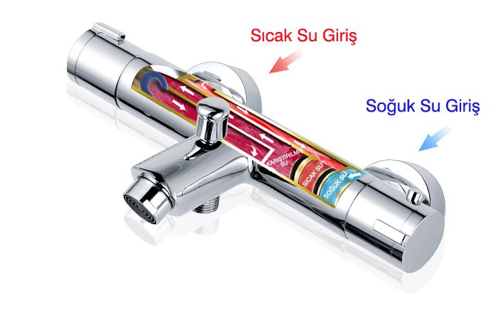 Önemli Not: Türkiye'deki standart tesisat yönü şekli ile banyonuzda duvarı karşınıza aldığınız zaman sol taraftan sıcak, sağ taraftan soğuk su çıkışı olması gerekmektedir. Sıcak ve soğuk su girişi için batarya arkasında bulunan kırmızı ve mavi oval etiketleri dikkete alınız. Aksi taktirde ürün ısı ayarını yapamayacaktır.