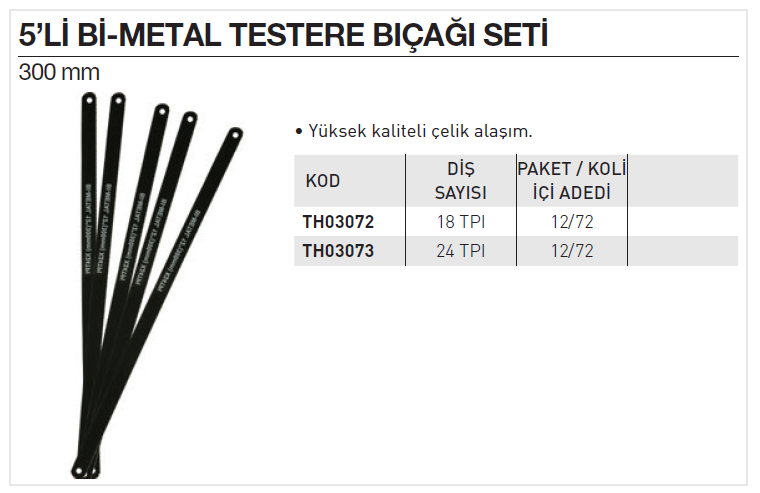 TH03072 18TPI 5’li Bi-Metal Testere Bıçağı