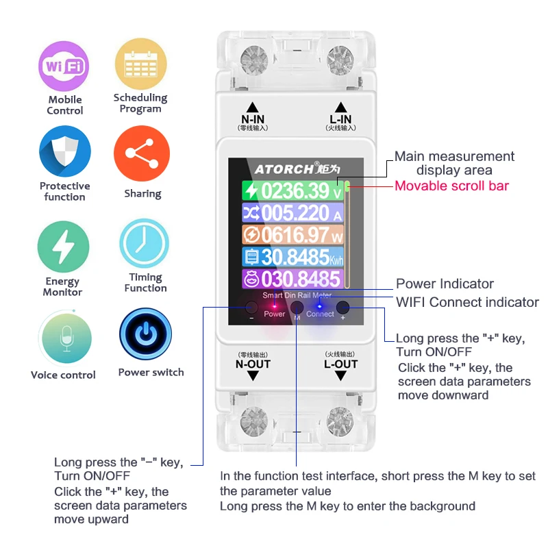 5.LCD ekran, Gerilim, Akım, Güç, toplam Enerji kWh'nin gerçek zamanlı gösterimi