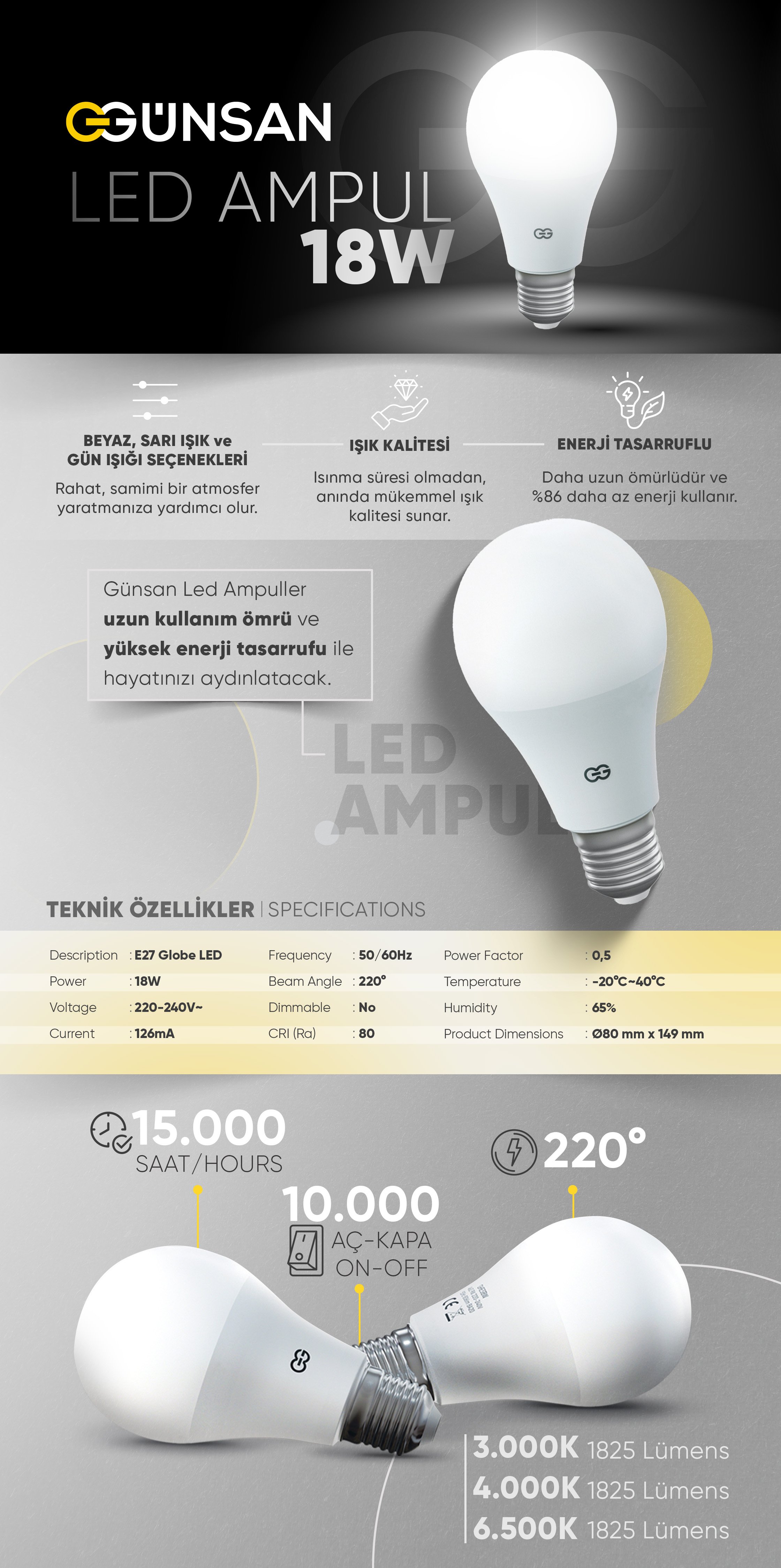 Günsan 18W LED Ampul, ortam aydınlatmasını kaliteli şekilde sağlayan bir ışık kaynağıdır. Ampulün başlığı E27 standart tip duylarla uyumludur. Elektrik şebekelerindeki yaygın voltaj aralığı olan 220-240V seviyesine uygun olması da pek çok alanda kullanılmasını sağlar. Öne çıkan başlıca özellikleri:
