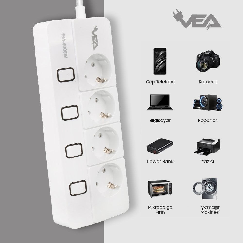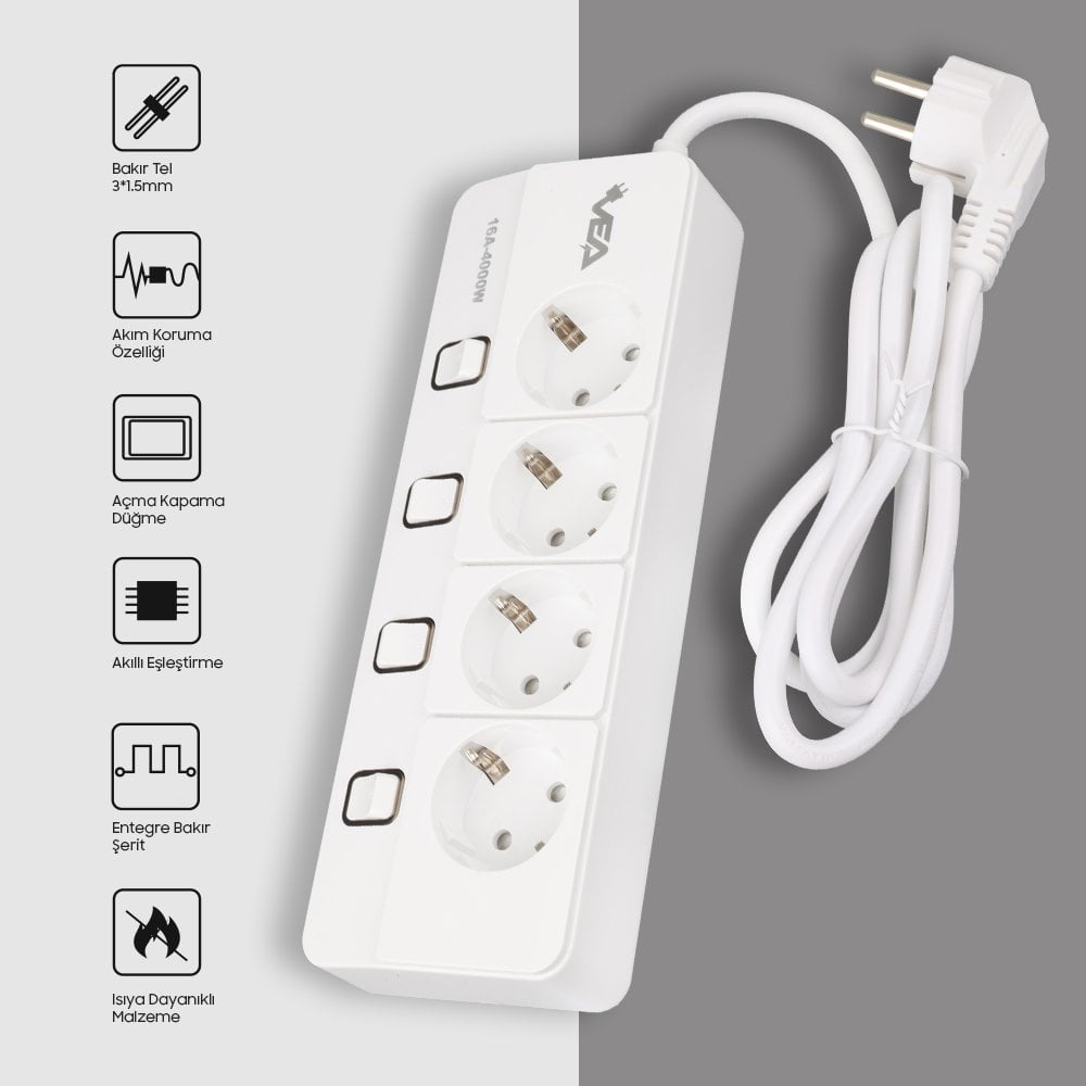 Vea VE-XMAN104, güvenliği ve dayanıklılığı bir araya getiren üstün özelliklere sahip bir grup prizdir. Parlak beyaz rengi ve kompakt boyutlarıyla, kullanımı kolay ve estetik bir çözüm sunar. Bu grup priz, 4000 watt gücü ve 16 amper akım kapasitesiyle elektrik ihtiyaçlarınızı karşılamak için ideal bir seçenektir.