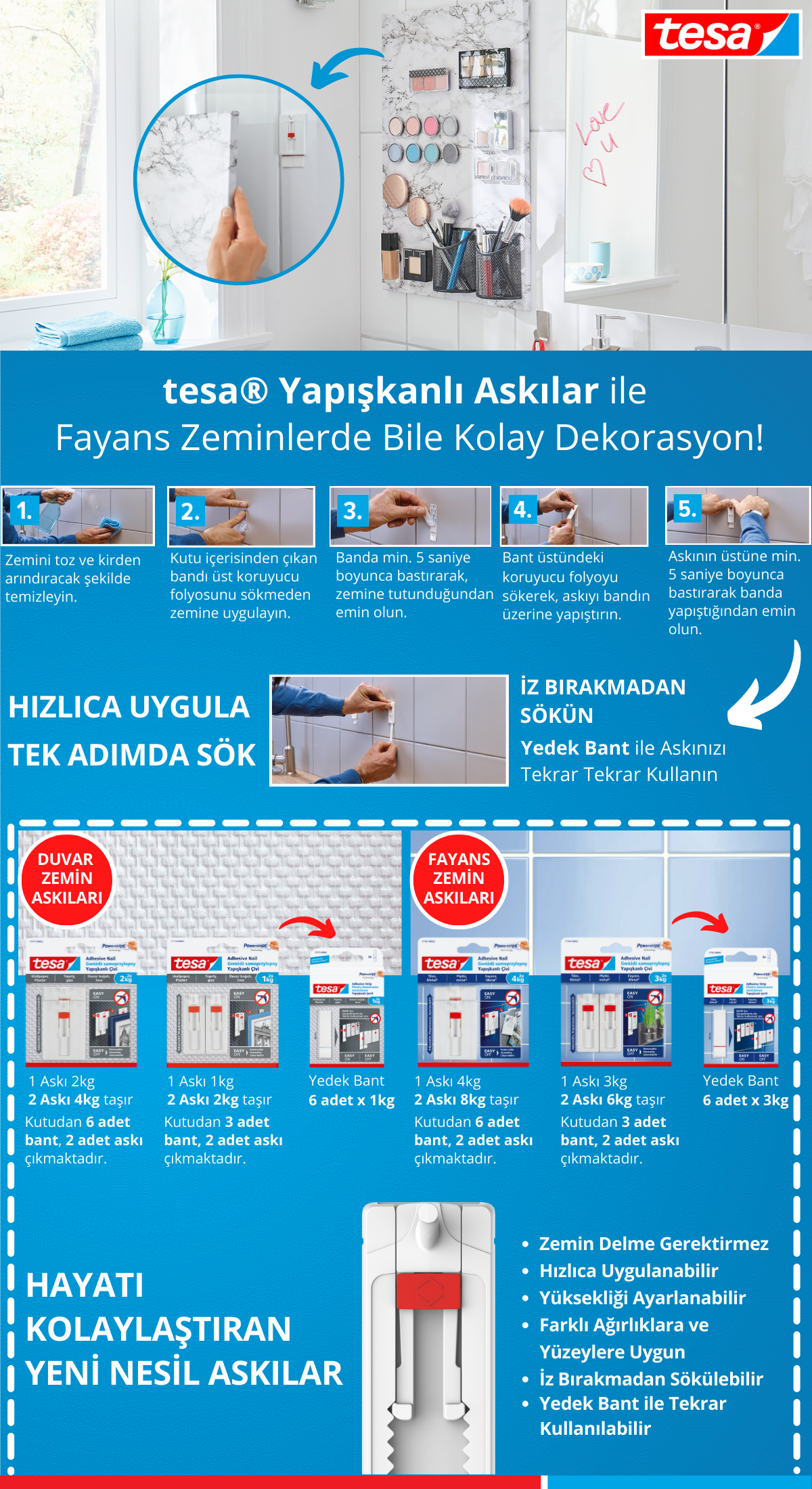 - Eğer Yapışkanlı Askıyı tekrar kullanmak istiyorsanız uyumlu tesa Fayans ve Metal Yüzeyler için Yapışkanlı Şerit Bantları temin edebilirsiniz.;